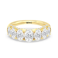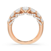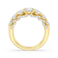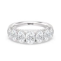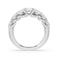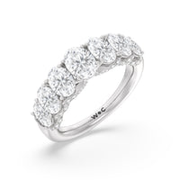 Don't be surprised when you see your beloved staring at this ring for hours on end. This gorgeous piece is designed with shiny curves and glittering swirls ready to enchant your bride-to-be. The ring features an arch of faceted oval-cut gemstones in graduating sizes elegantly. Underneath the brilliant gems are swirling ribbons of petite round diamonds.