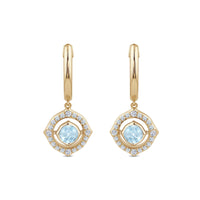 These pretty huggie earrings feature our signature charm motif with a row of pave lab-created diamonds as its outline and an alluring aquamarine at its center.
