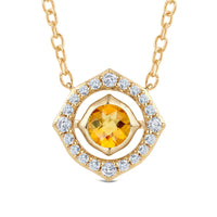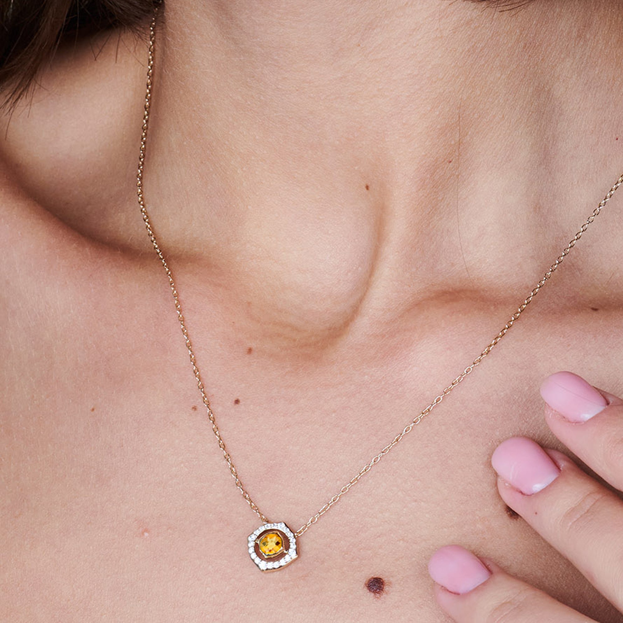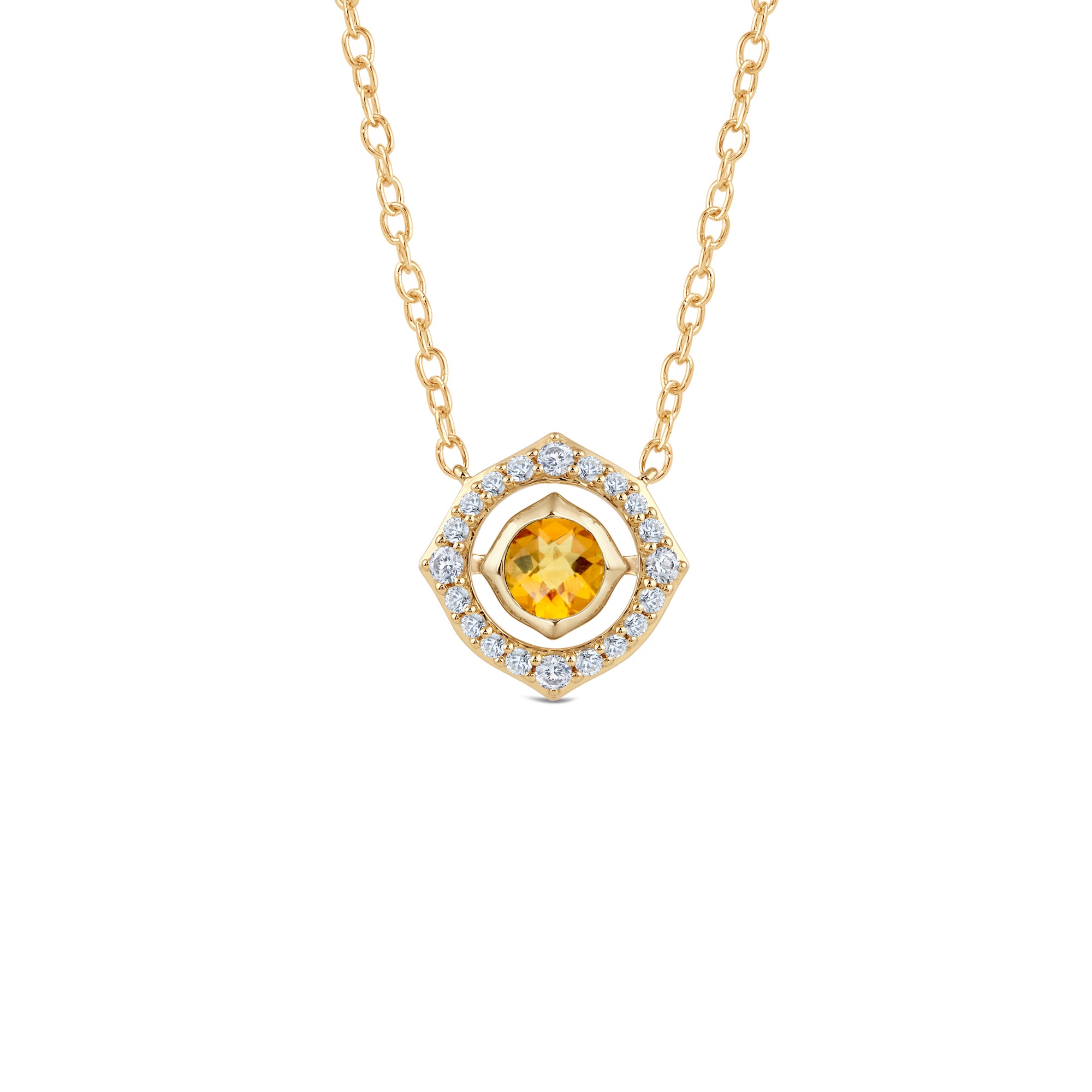 This pretty necklace features a row of pave lab-created diamonds as its outline with a vibrant citrine at its center. Featuring Novembers birthstone, the citrine, this stone is believed to uplift, heal and inspire motivation. Crafted in 14k yellow gold with 1/6Cts total diamond weight.