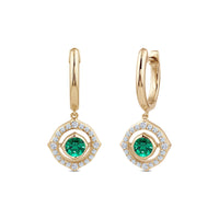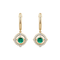 These pretty huggie earrings feature our signature charm motif with a row of pave lab-created diamonds as its outline and a rich created emerald at its center.