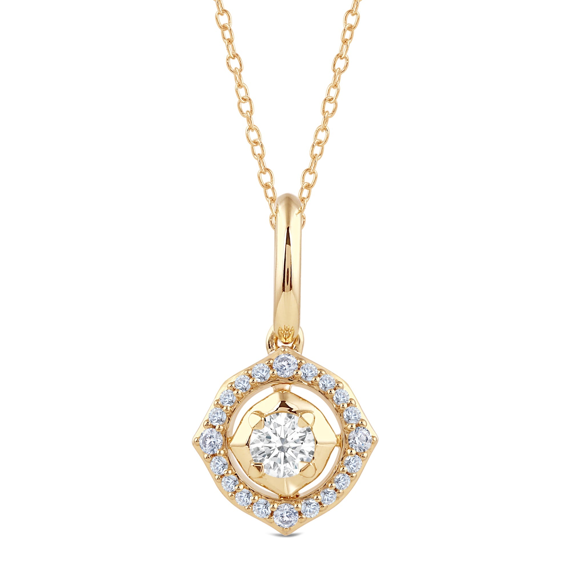 Sparkling lab-created diamonds create this striking double layered pendant. A pave outline frames a central lab-created round cut diamond. Crafted in 14k gold with 1/4Cts total diamond weight.