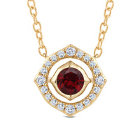 This pretty necklace features a row of pave lab-created diamonds as its outline with a rich garnet at its center.