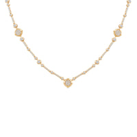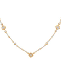 Stunningly glamorous, this lab-created diamond necklace wraps elegantly around the neck, creating an aura of shimmering light. Mixing lines of diamonds along with pave set diamonds signature sculpted cushion-shaped motifs, this necklace is red-carpet ready! Set in 14k gold with 2 3/4Cts total diamond weight.