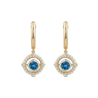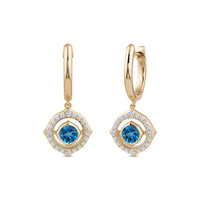 These pretty huggie earrings feature our signature charm motif with a row of pave lab-created diamonds as its outline and a captivating London blue topaz at its center.
