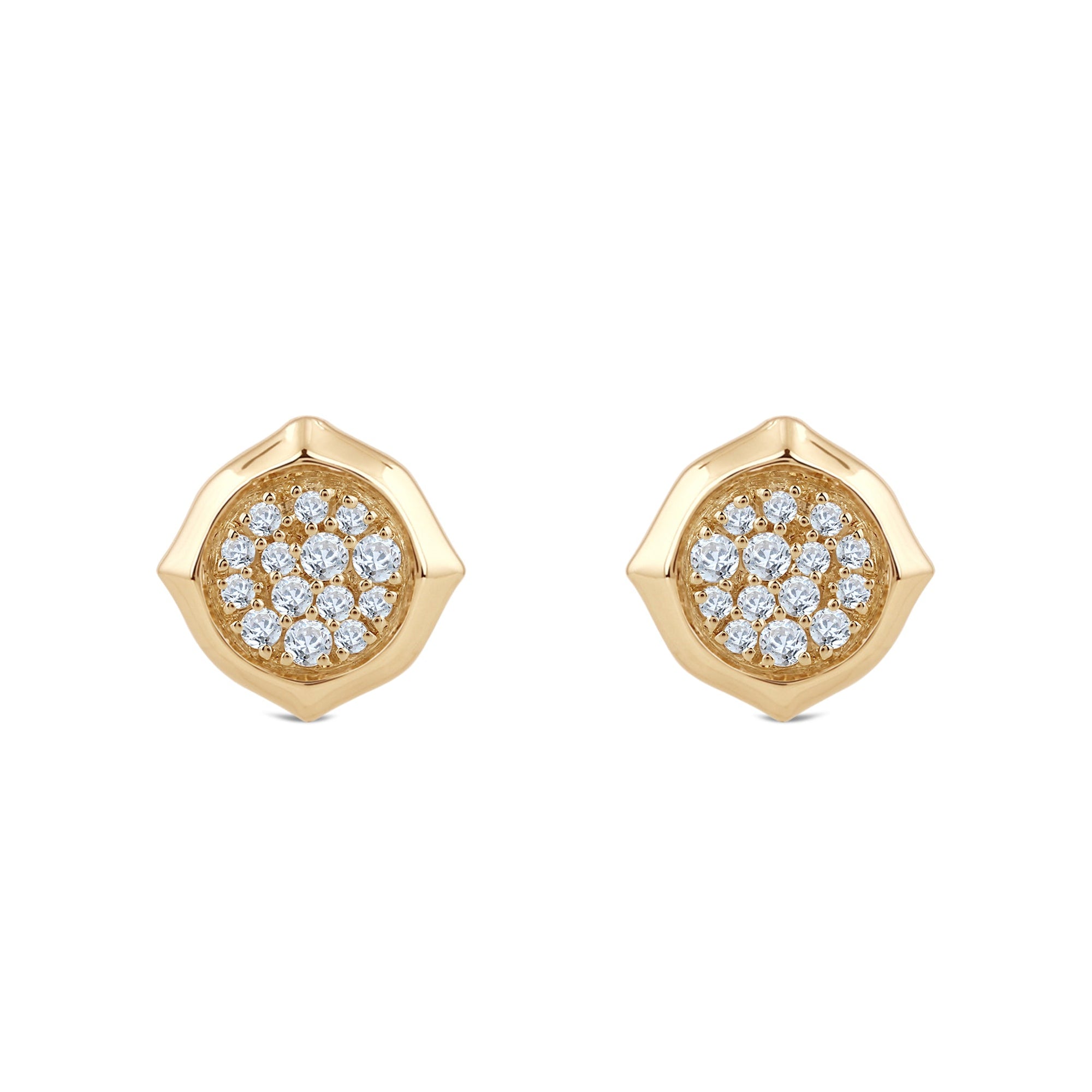 Pave lab-created diamonds set in lustrous metal create a signature sculpted cushion shape that shines bright and elevates any everyday look. Set in 14k gold with 1/5Cts total diamond weight.