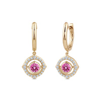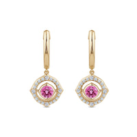 These pretty huggie earrings feature our signature charm motif with a row of pave lab-created diamonds as its outline and a dazzling pink tourmaline at its center. Featuring Octobers birthstone, the pink tourmaline, this stone is believed to bring compassion, wisdom, unconditional love and friendship. Crafted in 14k yellow gold with 1/4Cts total diamond weight.