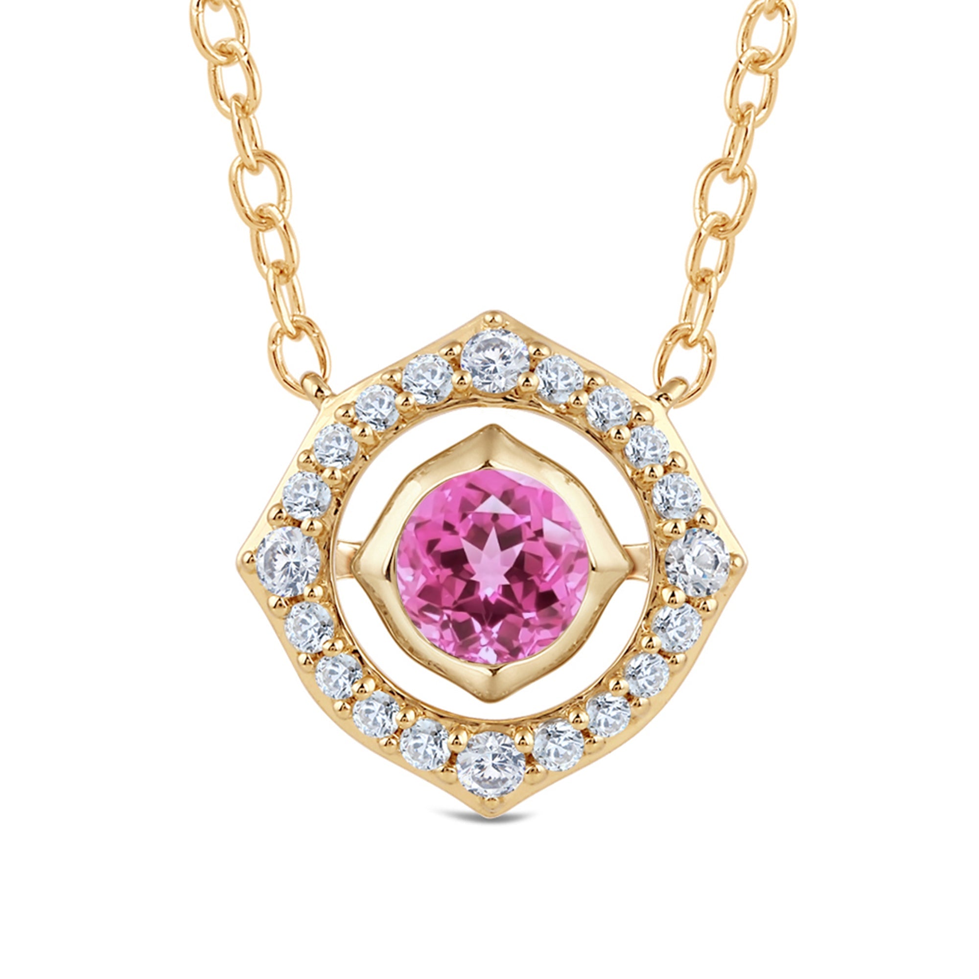 This pretty necklace features a row of pave lab-created diamonds as its outline with a dazzling pink tourmaline at its center. Featuring Octobers birthstone, the pink tourmaline, this stone is believed to bring compassion, wisdom, unconditional love and friendship. Crafted in 14k yellow gold with 1/6Cts total diamond weight.