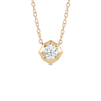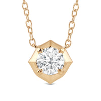 An updated setting gives this solitaire pendant a modern appeal. The lab-created round brilliant diamond is held in a sculpted cushion-shaped bezel setting. Crafted in 14k gold with 1/2Cts total diamond weight.