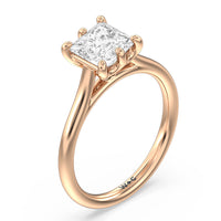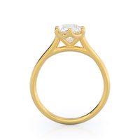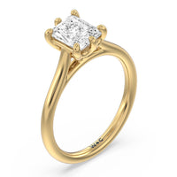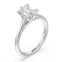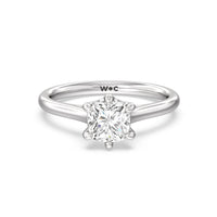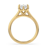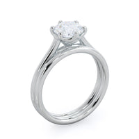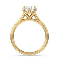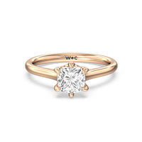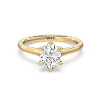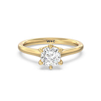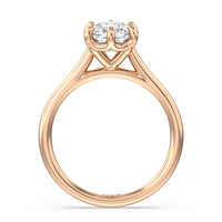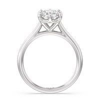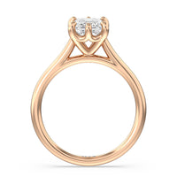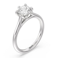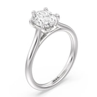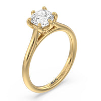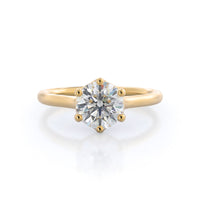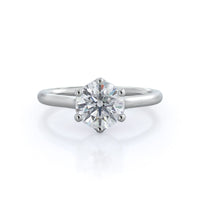 This six prong solitaire ring seamlessly cradles a round diamond in a cathedral basket design. Six prongs secure the diamond while cathedral windows let in light to maximize sparkle.