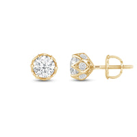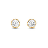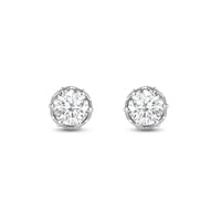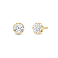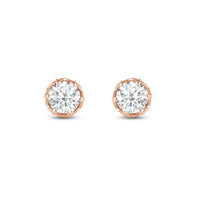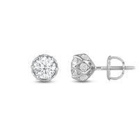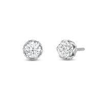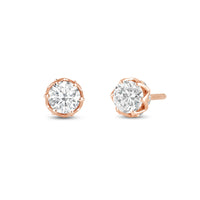 Not your usual studs, for sure. These diamond earrings have their brilliant stone mounted on an ornate six-prong tulip basket. The basket's lovely contours can be seen when each stud is viewed from its top. A view from the side, on the other hand, reveals additional diamonds punctuating each four-sided polygon that makes up the unique design of the basket setting.