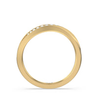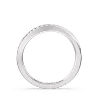 This curved diamond set wedding band is perfectly contoured to complement our six prong solitaire wavy diamond shank engagement ring for a simple and sophisticated look.