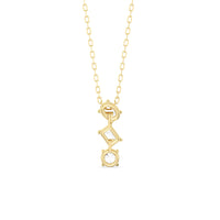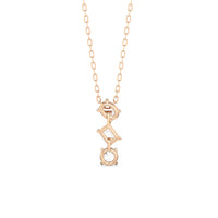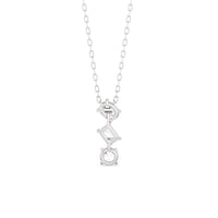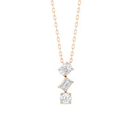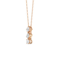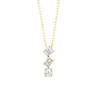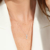 This diamond trilogy necklace embraces modern elegance with its minimalist aesthetic. It features a vertical row of oval, pear, and round diamonds, each weighing 0.25 carats. Designed with no distracting embellishments, this necklace's pure beauty shines.
