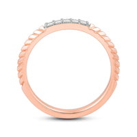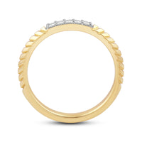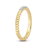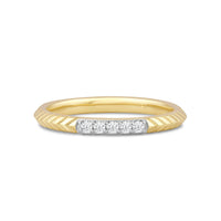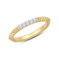 A delicate yet edgy ring perfect for easy and streamlined dressing. This piece features a slim band with a carved or ridged detail. A short row of diamonds breaks the textured surface of the ring. Think of this as the accessory you can turn to daily when you want to give your look personality.