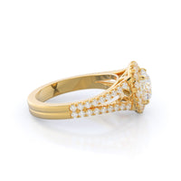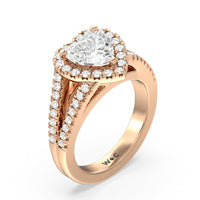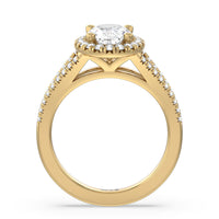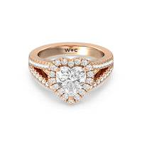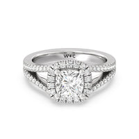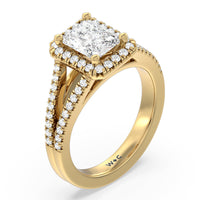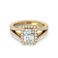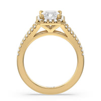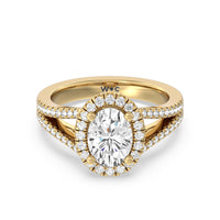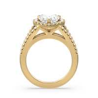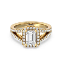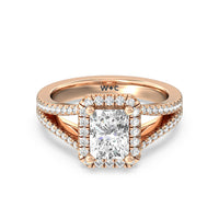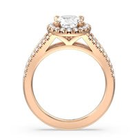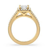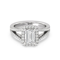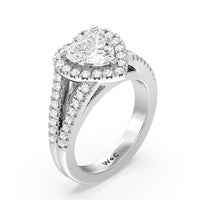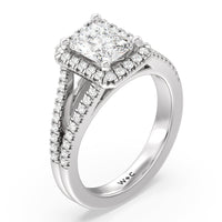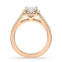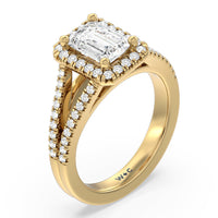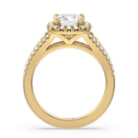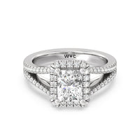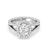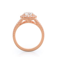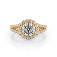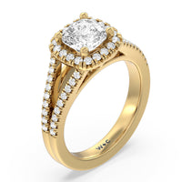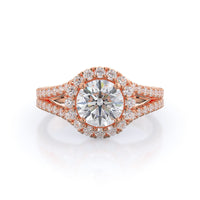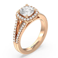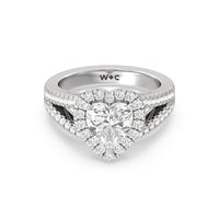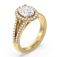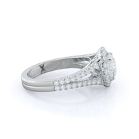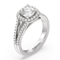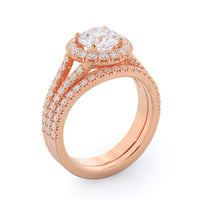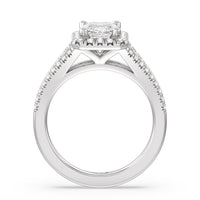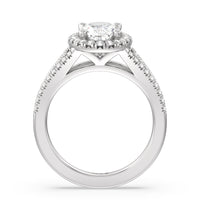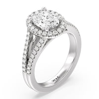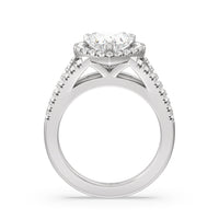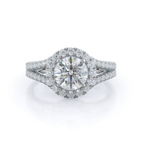 Stunning diamonds make up a French set halo and a diamond accented band for a full and sparkling look. A split shank band makes the ring a true stand out.