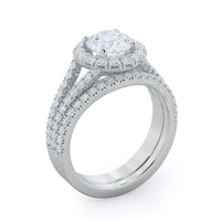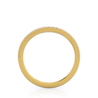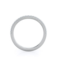 You'll barely notice the curve in this pave wedding band when you see it on its own, but you'll love how it transforms your two pieces of jewelry into one stunning wedding ring stack. The slight curve allows this band to sit right next to your engagement ring, even as it widens for the split shank setting near the center diamond.