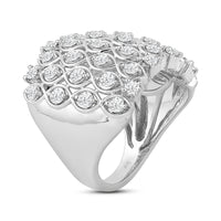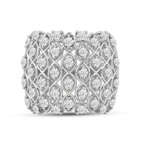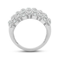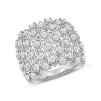 It's hard to miss this piece which stands out for its broad profile and non-stop shimmer. This statement ring with a broad top features a cluster of round diamonds that deliver enough sparkle to make an impact. A ring as sparkly as this can instantly add drama and allure to a monochromatic outfit.