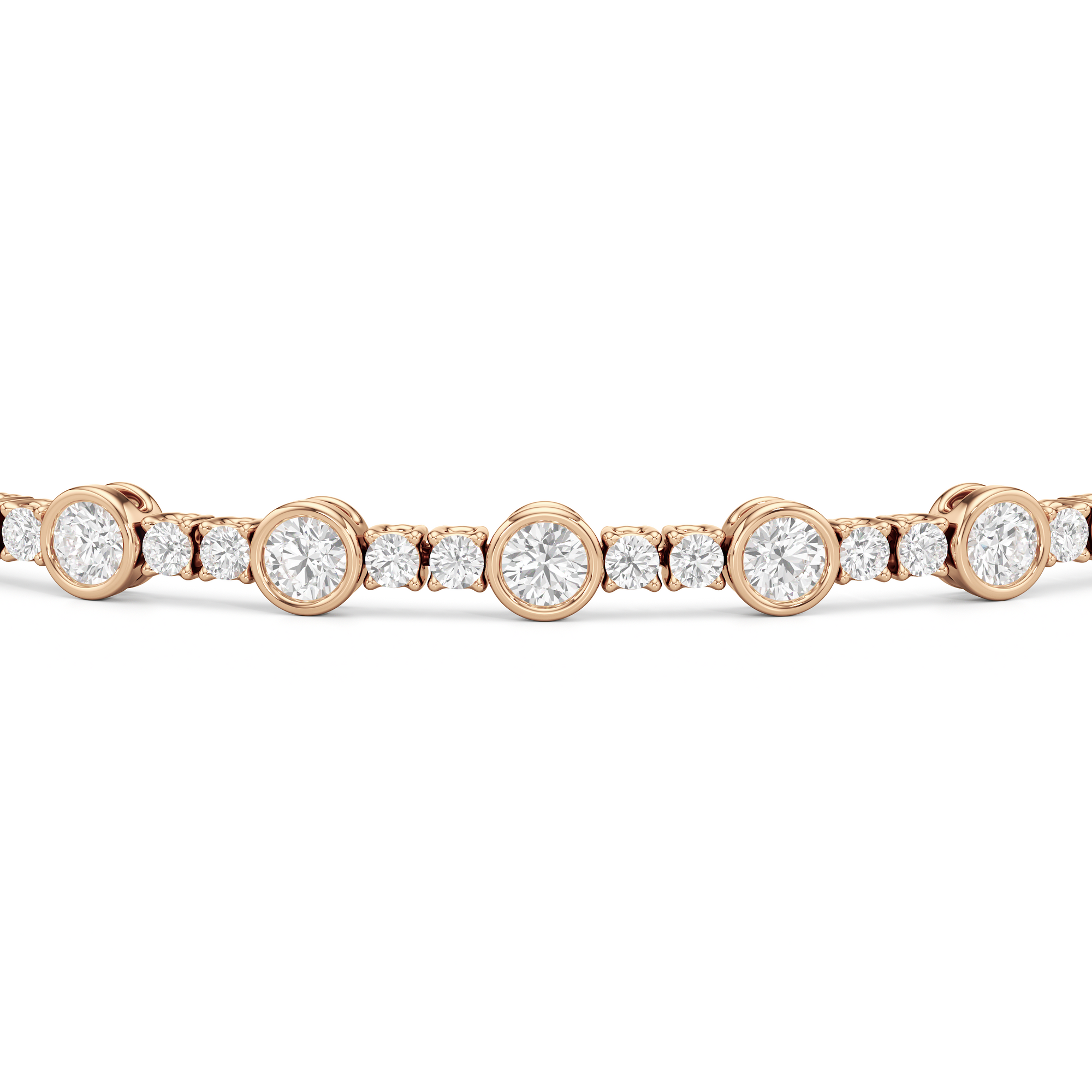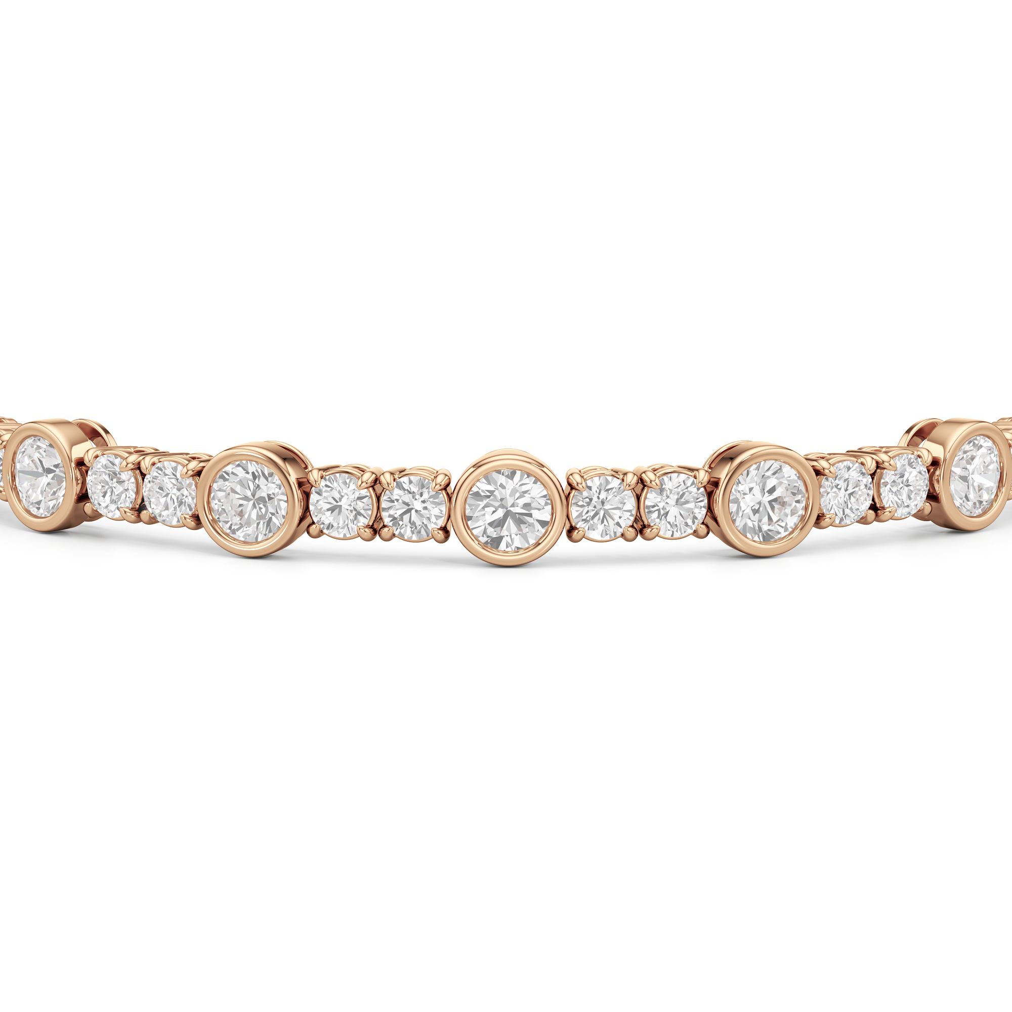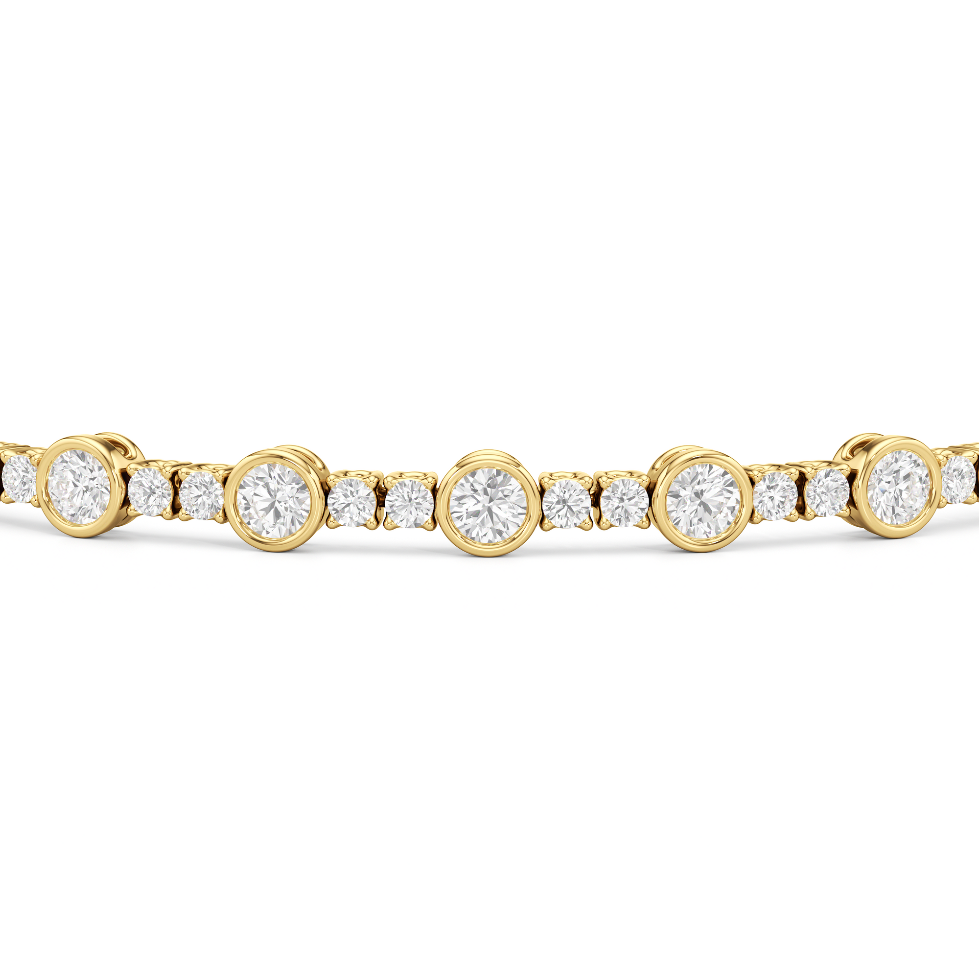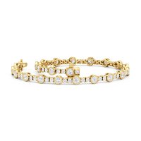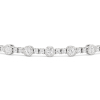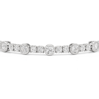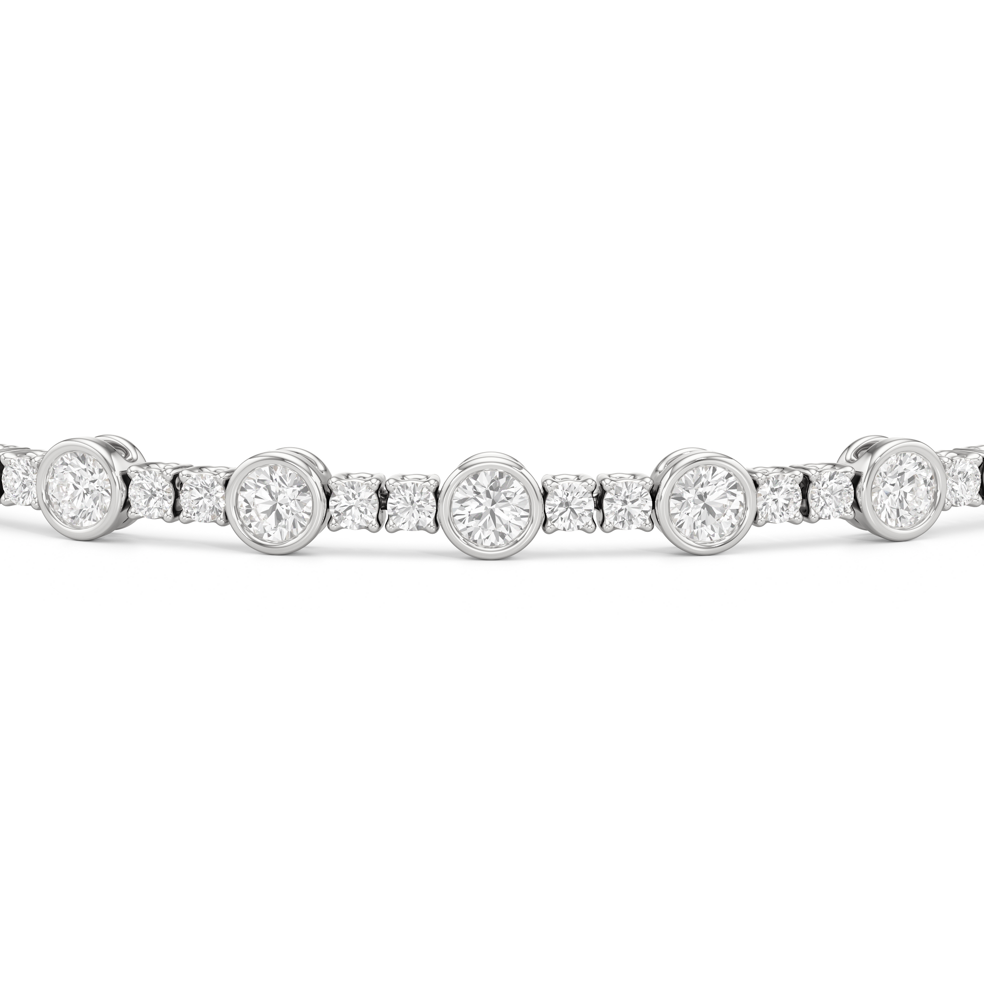 A testament to our vision of harmonizing luxury and simplicity. This tennis bracelet features a continuous line of round diamonds laid out in a pattern of one alternating bezel-set round diamond and a duo of claw prong-set round diamonds. The bracelet's understated design showcases the unparalleled fire and brilliance of the most popular diamond shape.