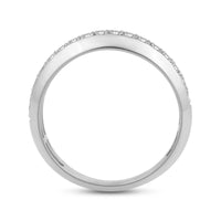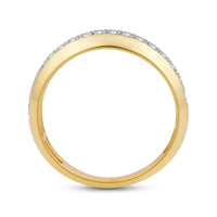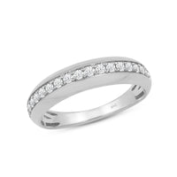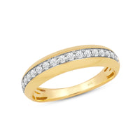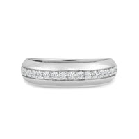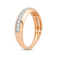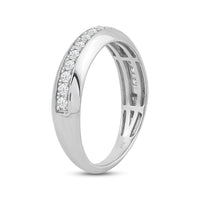 The low-key elegance of this diamond ring makes it perfect for modern minimalists. This ring features a high dome silhouette with the slanting edges in polished finish. The center of the shank is traced by a row of diamonds that runs halfway through the band.