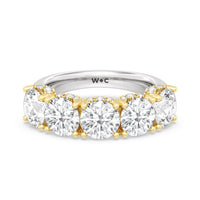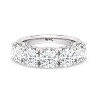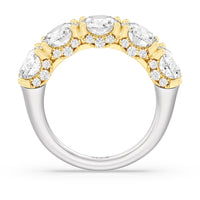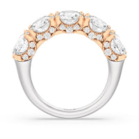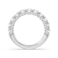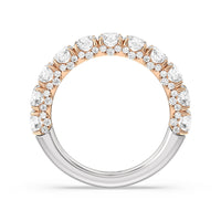Designed in equal parts feminine and glam, this diamond anniversary ring will once again sweep your beloved off her feet. The ring features a two-toned construction, with the band in a different metal color than the stylish U-shaped prongs. Round diamonds line half of the band's circumference, complemented by petite round diamonds that trace the sides of the U-shaped prong baskets.
