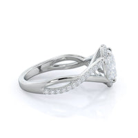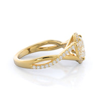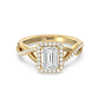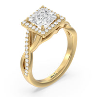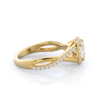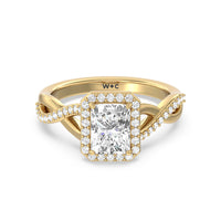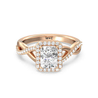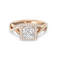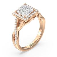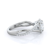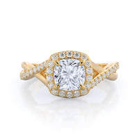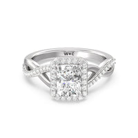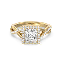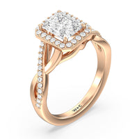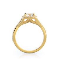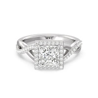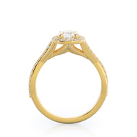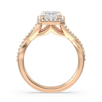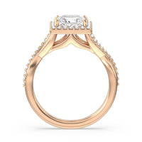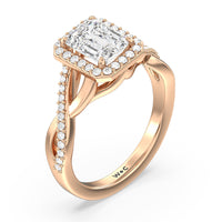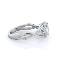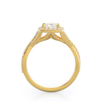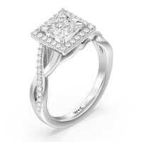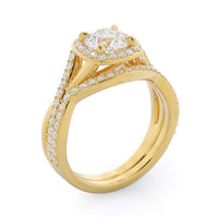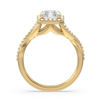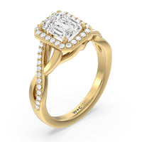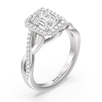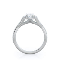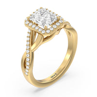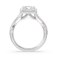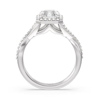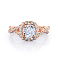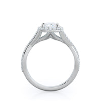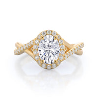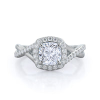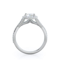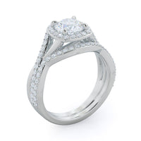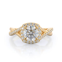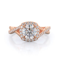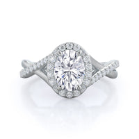 A split shank design which alternates between smooth metal and diamond accent set band. The two portions gracefully come together to meet a perfectly set halo around the center diamond.