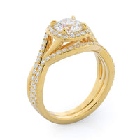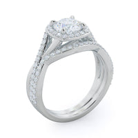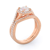 Diamonds wrap up the side of this pave wedding band before the entire thing sways in the middle in a graceful arch. Thanks to this wave-like shape, your matching wedding band will hug the path of your split shank setting and peak out from the side of your halo for additional sparkle.