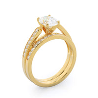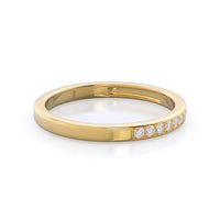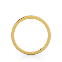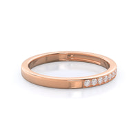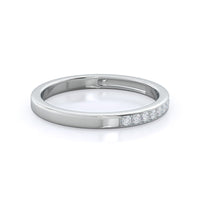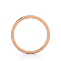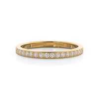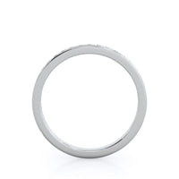 Our Tapered Cathedral Diamond Engagement Ring may end its pave in points, but this matching wedding band continues the sleek accent diamond design all the way across the top of its design. Just like with the diamond ring, the stones on this pave wedding band are sunken into the ring with metal barriers on the sides for maximum security.