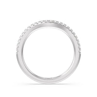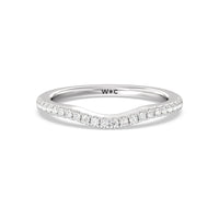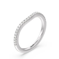 This curved diamond set wedding band is perfectly contoured to complement our tapered cushion halo engagement ring for a simple and sophisticated look.