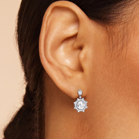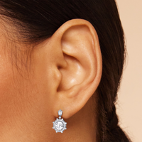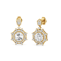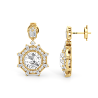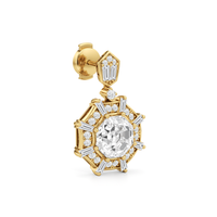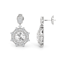 Drawing inspiration from the iconic octagonal ceiling of One Bunker Hill, these gorgeous drop earrings bring the bold spirit of Art Deco to life. Echoing the octagon-within-an-octagon motif of the landmark's grand lobby, these earrings feature an octagonal diamond center stone framed by an octagon-shaped halo set with sparkling diamonds. Radiating from the center are baguette diamonds set in between pairs of baby pavé-set round diamonds, evoking the dynamic energy of the era. The eight-sided drop gently suspends from a six-sided polygon base, punctuated with a duo of baguette diamonds and a trio of petite round diamonds. A single round diamond connects the drop to the base, completing the resplendent beauty and timeless elegance of these earrings.