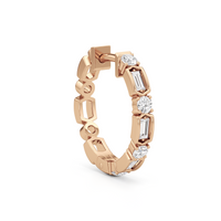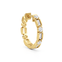 These are the hoops that will get you hooked. They feature a row of alternating round and baguette diamonds, with each step-cut stone secured by double prongs and set on a six-sided bezel. This pair is ready to update any look.
