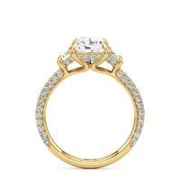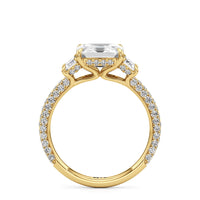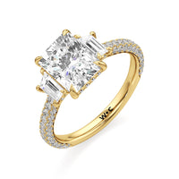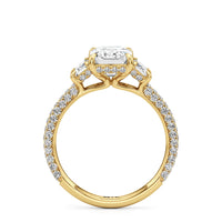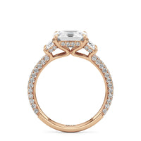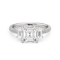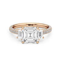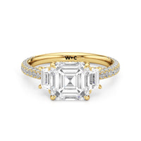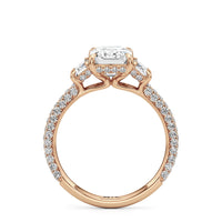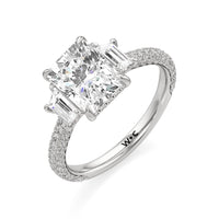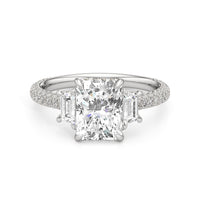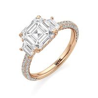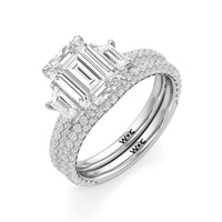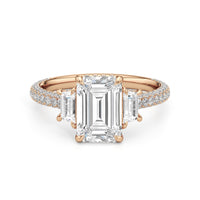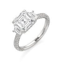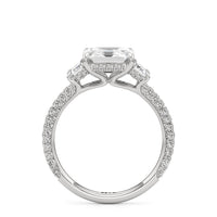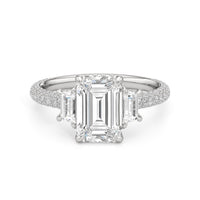 The trilogy ring at its most sculptural and dramatic. This three-stone ring boasts trapezoid-cut diamond side stones that offer outstanding finger coverage and vintage charm. The four-sided step-cut stones flank a main diamond mounted on four claw prongs that stylishly bend, extend, and form the ring's bridge. Petite round diamonds trace the rails of the three-stone centerpiece and over half of the band's circumference.