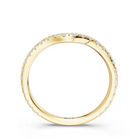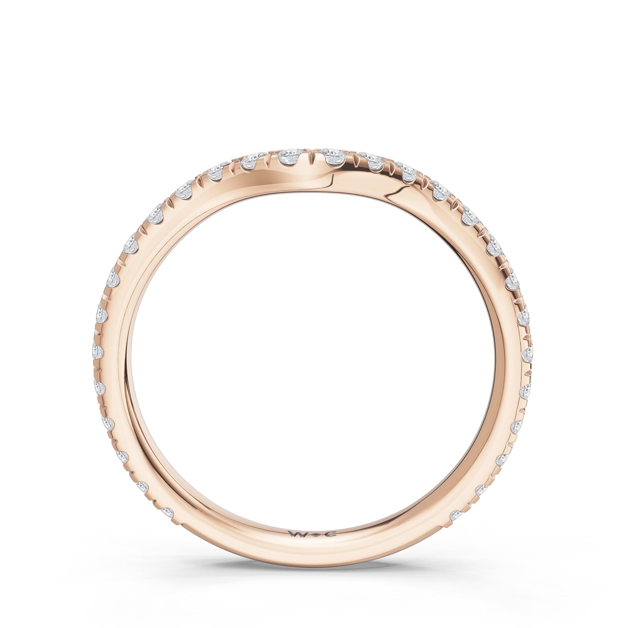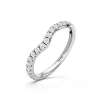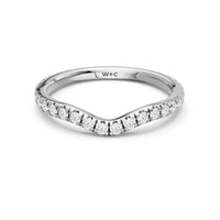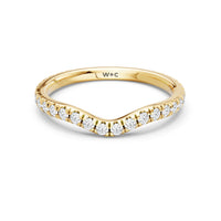 This curved diamond set wedding band is perfectly contoured to complement our the arden ring for a simple and sophisticated look.