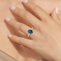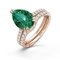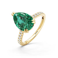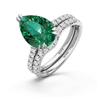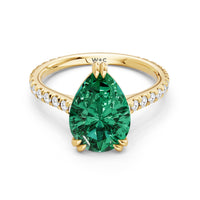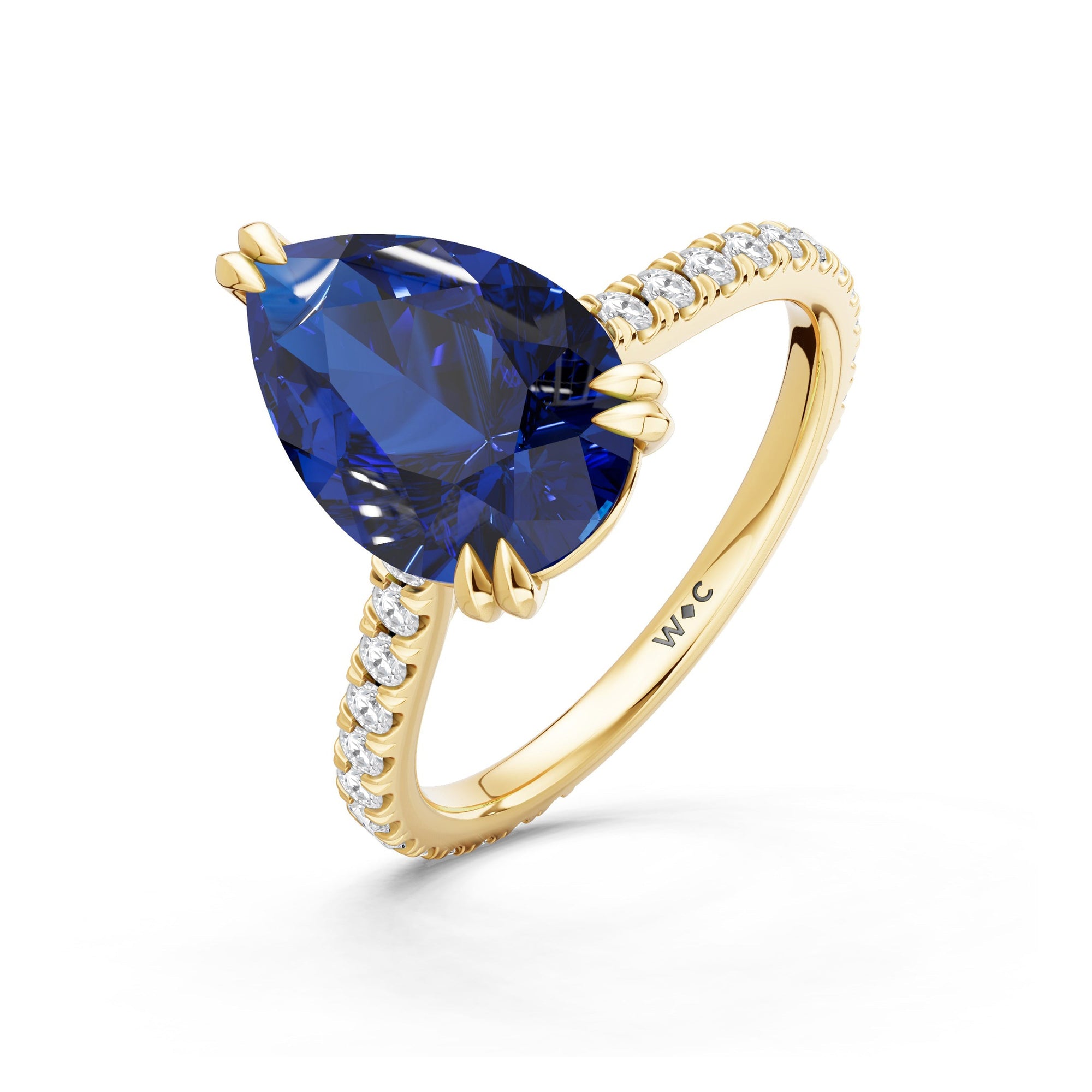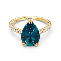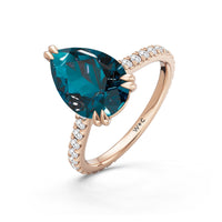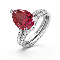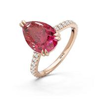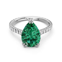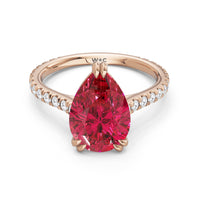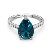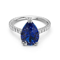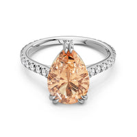 This pear-shaped ring features refined double-claw prongs with a signature crossover design that securely cradles the center stone. The pavé-set band adds subtle brilliance along the shank, creating a sleek and sculptural look from every angle.