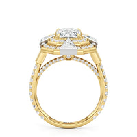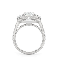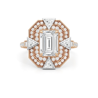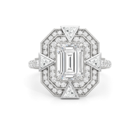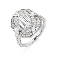 A ring that channels the very soul of Art Deco. At its heart is an emerald-cut diamond on claw prongs, its clean lines and crisp corners evoking clarity and strength. Framing the center stone are double octagonal halos of round diamonds, complemented by four trillion-cut diamonds that fan out like stylized arrowheads. Milgrain beads trace the contours of the centerpiece, evoking the intricate grillework that once adorned grand lobbies. The shoulders of the band are marked by a baguette diamond, its mirror-like reflection enhanced by the brilliance of the diamonds that run along the shank and the ring's bridge. All these design elements weave geometry and glamour into a powerful statement of polish and precision.