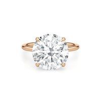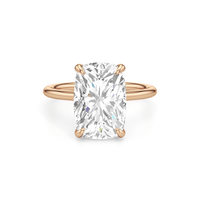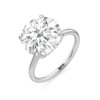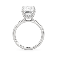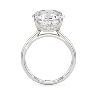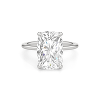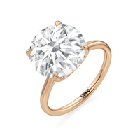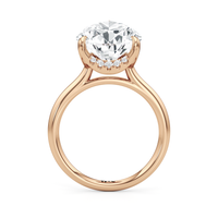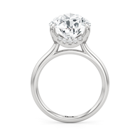 The sleek, sculptural, and striking Cassatt Solitaire Engagement Ring is clearly a statement of design. Its center stone is secured by four claw prongs and cradled by a diamond-studded drape hidden halo. The open diamond space allows light to pass through freely, while the plain shank lifts the central stone into the spotlight it deserves.