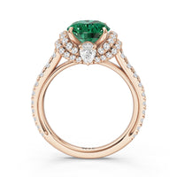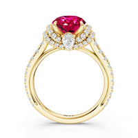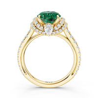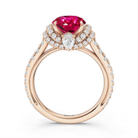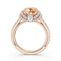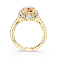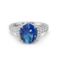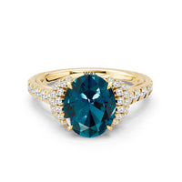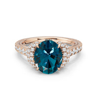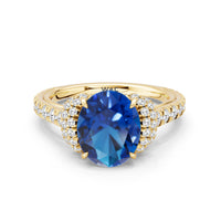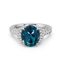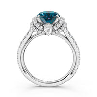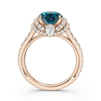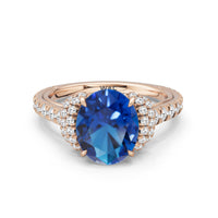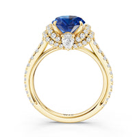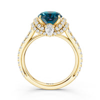 Centered on a Blue Sapphire, this ring is flanked by double epaulet diamonds that add structure and elegance. Beneath, a pear-shaped peekaboo diamond catches light with a gentle shimmer. Smooth lines and a pavé band finish the design with balanced grace.