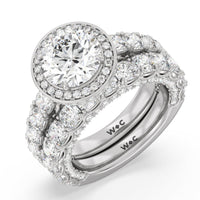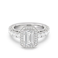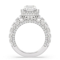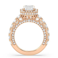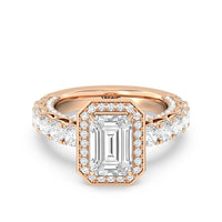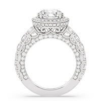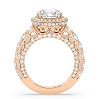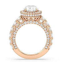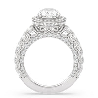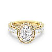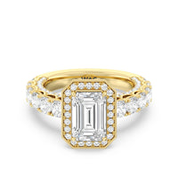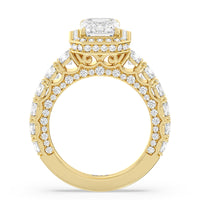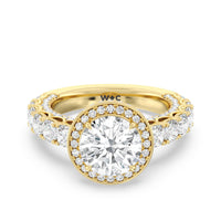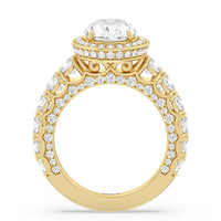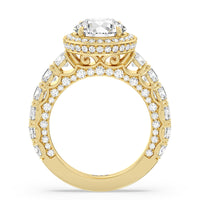 This is one gorgeous bling that will leave your darling speechless. A view from the top reveals two glittering shoulders that lead to a magnificent central diamond framed by a glittering halo. A view from the side showcases an intricately designed gallery with scalloped wave metalwork in yellow gold, enhanced by the presence of an arch of diamonds.