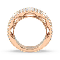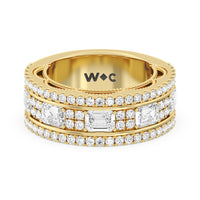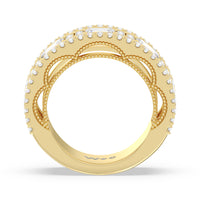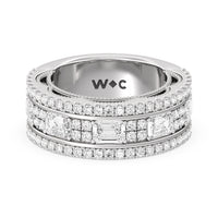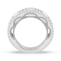 A uniquely beautiful ring that has the look of a precious heirloom. This half-eternity wide band anniversary ring comes dressed in elegance. More than half the shank is decorated with emerald-cut diamonds alternating with clusters of four round diamonds. A smooth and polished metal ridge separates this row from the edges traced with more round diamonds. A view of the ring's sides shows a scalloped, floral-themed outline of diamonds in micro prongs.