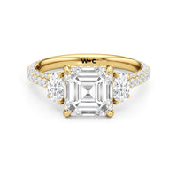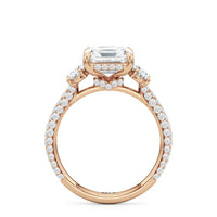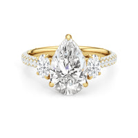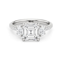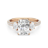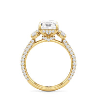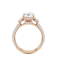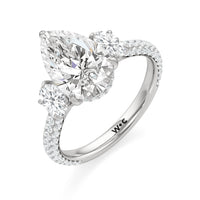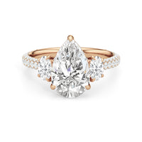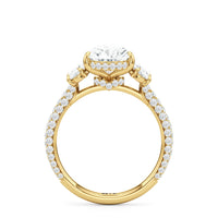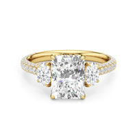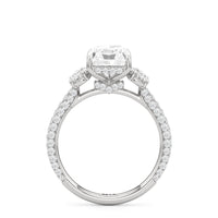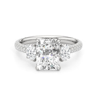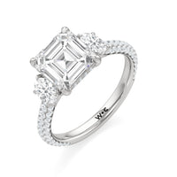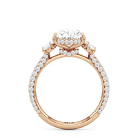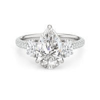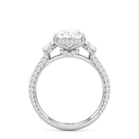Striking the perfect balance between opulence and refinement, this three-stone ring is simply irresistible. Petite round diamonds cover nearly the entire circumference of the ring. The main stone is cradled by claw prongs and adorned with a diamond-studded rail and hidden halo. Oval side stones sit on either side of the focal gem, complementing the main diamond and creating a harmonious design.
