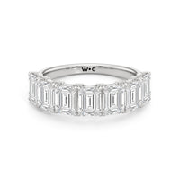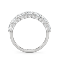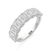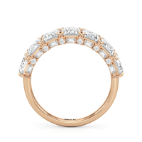 A classic north-south anniversary ring inspired by one of Manhattan's most distinguished Art Deco landmarks—the Beresford. This meticulously crafted piece reflects the vertical grandeur of the Beresford's twin towers through its elongated silhouette. Half of the ring's circumference is covered by emerald-cut diamonds, set in a seamless row, echoing the building's sense of symmetry and stature. When viewed from the sides, a sunburst pattern composed of alternating round and baguette diamonds can be seen. This unexpected design element captures the decorative flourishes of the Jazz Age, radiating the spirit of optimism, movement, and ageless elegance.