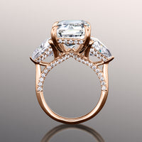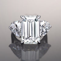 Unveil this three-stone design crafted to turn heads, that enfolds confidence with its dramatic silhouette. The ring boasts an imposing emerald-cut diamond with distinctive mirror-like facets. The step-cut center stone is flanked by two trillion-cut side diamonds on v-shaped prongs. Petite round diamonds trace the rail on each prong setting. More round diamonds adorn the gallery, allowing the ring to exhibit a beautiful symphony of glitter and shine.