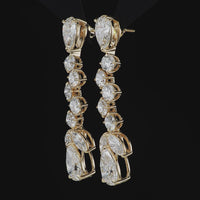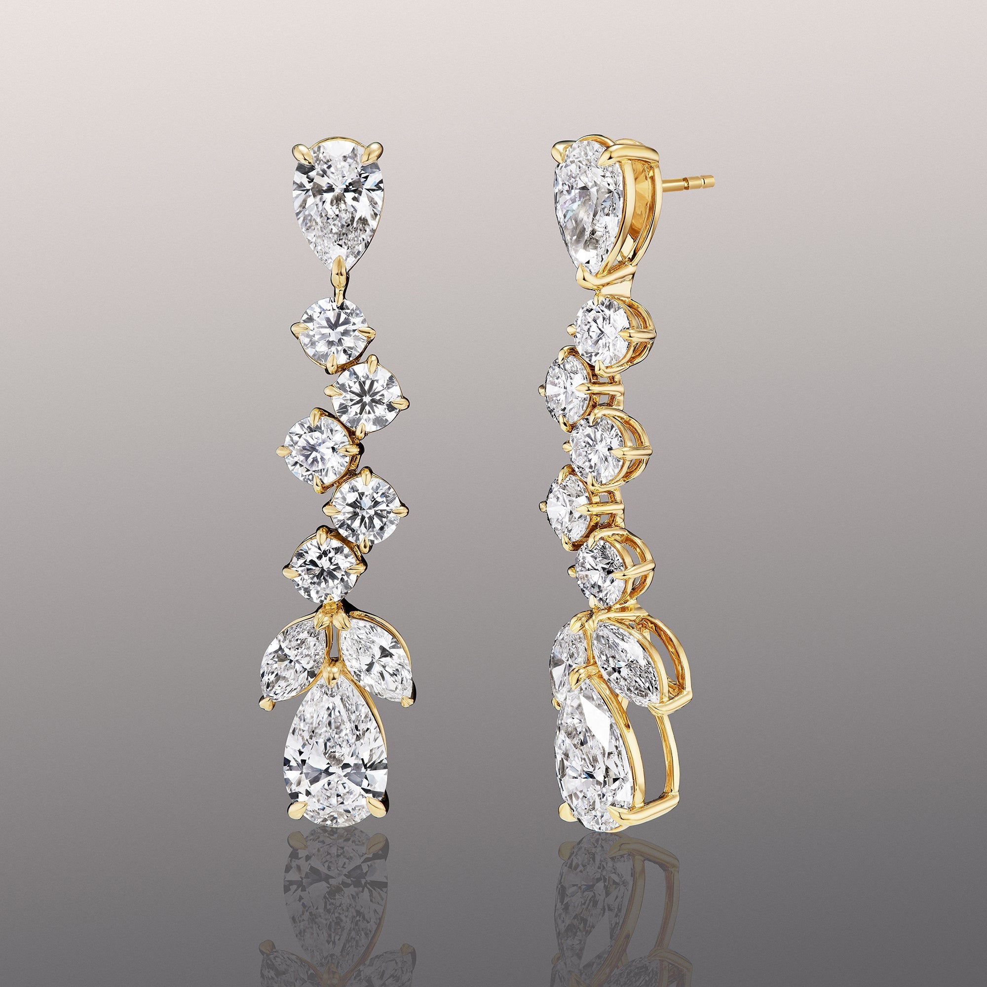 The luxurious asymmetrical shapes of these earrings embrace captivating beauty. Exquisitely fashioned in precious gold, these earrings carry an assortment of pear, round, and marquise diamonds that converge to form a graceful, vine-like silhouette.