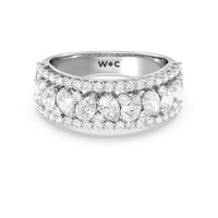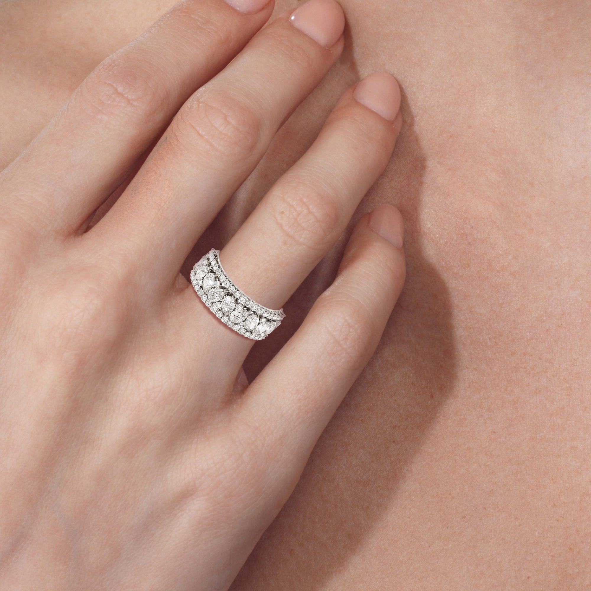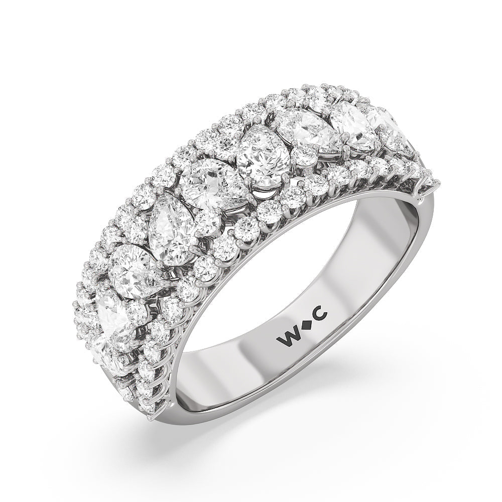 Your non-conforming special someone will surely be captivated by the brilliance of this ring. It features a tapering band with a wide top bordered by a row of round stones on its edges. At the center is a band of pear-shaped and round stones in a "dancing" pattern. Giving this studded anniversary ring to celebrate a milestone in your relationship will surely leave a lasting mark.