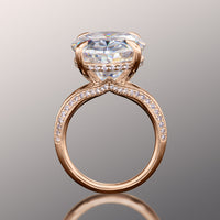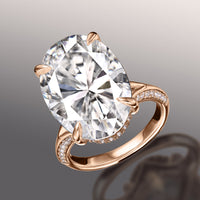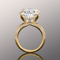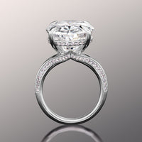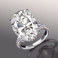 Revel in the beauty of love with sophisticated simplicity. This ring features a refined profile with sensuous curves elegantly traced by sparkling round diamonds. A oval diamond stands proud above the chevron-styled split shank. Cradling the brilliant center stone is a four-prong setting with a diamond-laced rail.