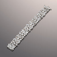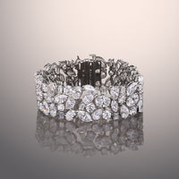 A fusion of geometry and grace, this diamond bracelet showcases a cluster of round, oval, pear, marquise, and princess-cut diamonds. The precious diamonds are arranged to form a wide band that encircles the wrist with lustrous beauty.