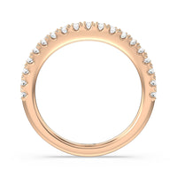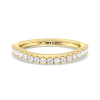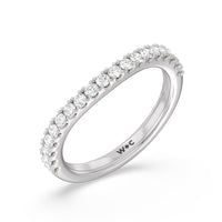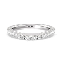 This curved diamond set wedding band is perfectly contoured to complement our heritage halo milgrain diamond accented gallery engagement ring for a simple and sophisticated look.