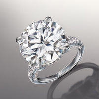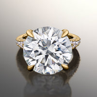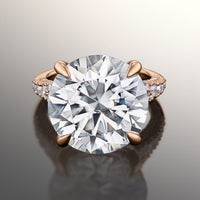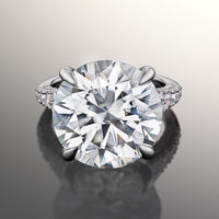 Romantically luxurious, this ring makes the perfect evocation of love that is unconditional, unlimited, and unfiltered. The design features a split cathedral shank with diamond-encrusted split shoulders that bend in a concave fashion. The glittering shoulders support a majestic round diamond centerstone sitting high on a four-prong setting. A gallery of petite round diamonds elevates the shine of this enchanting ring.
