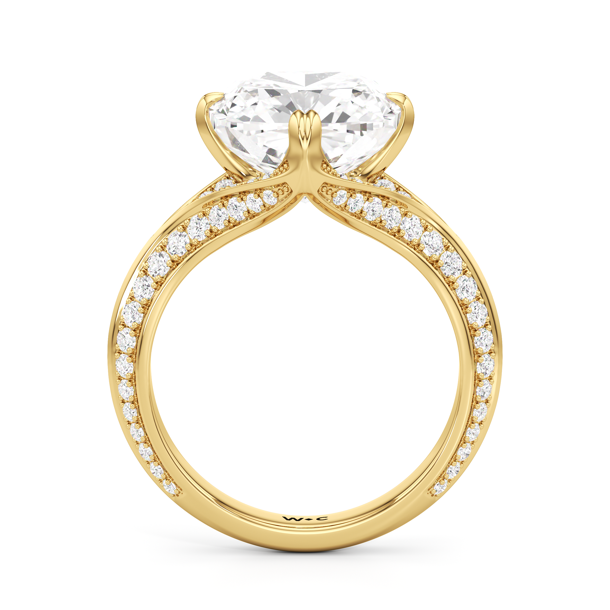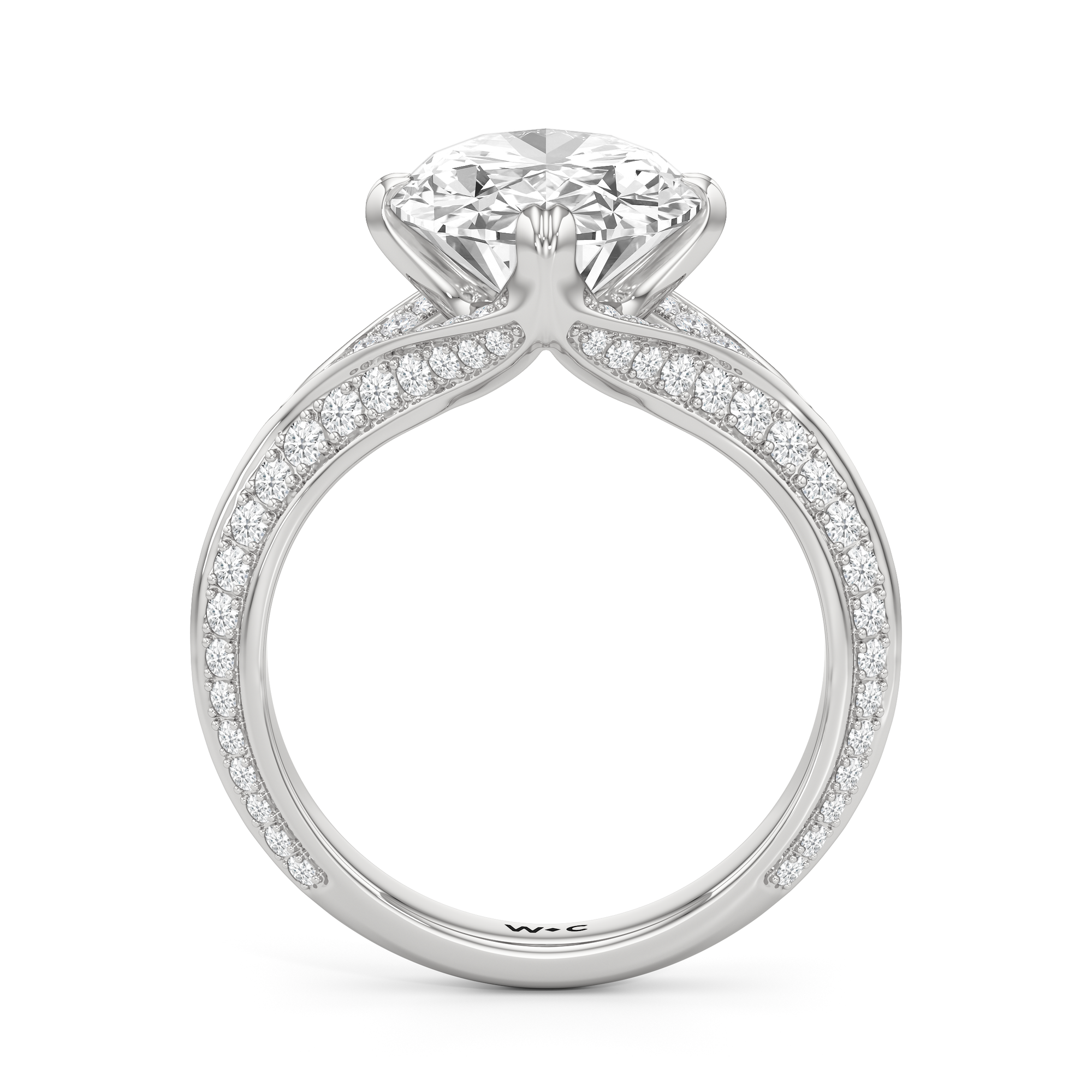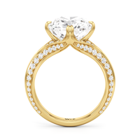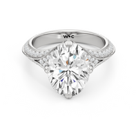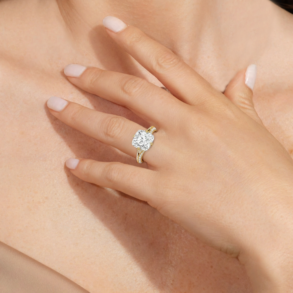 This ornate engagement ring features a striking kite-set center stone that creates a bold, modern focal point. A split shank adds openness and elegance to the silhouette, while a discreet peekaboo diamond beneath the setting offers a subtle, unexpected touch of brilliance.