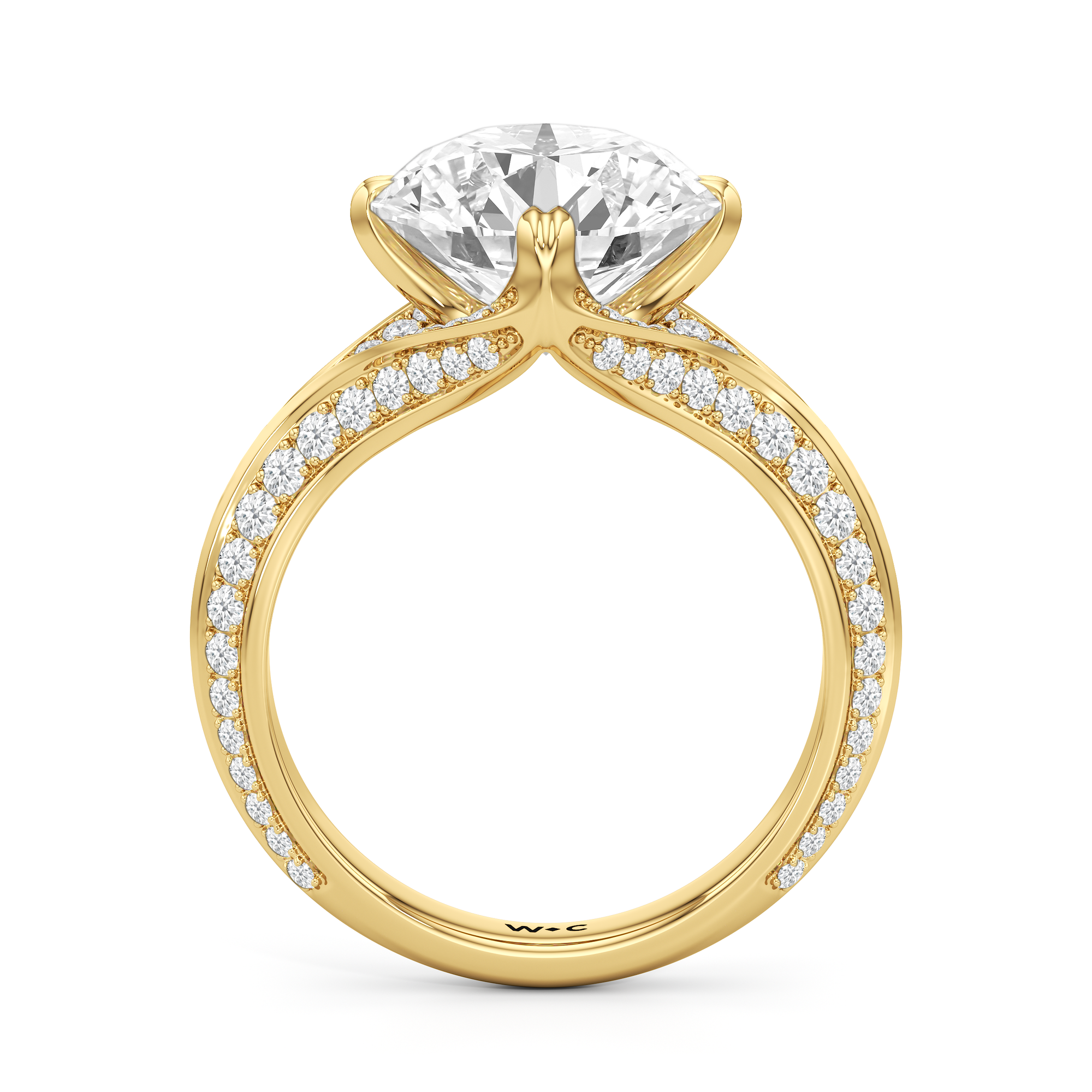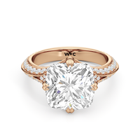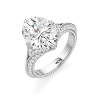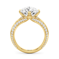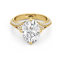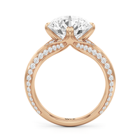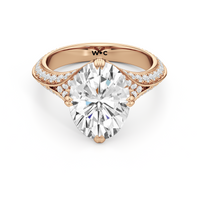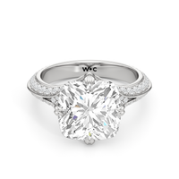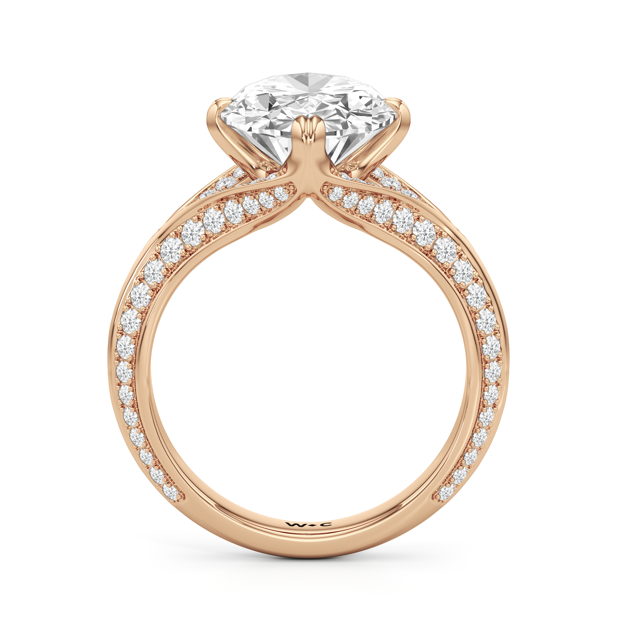 This ornate engagement ring features a striking kite-set center stone that creates a bold, modern focal point. A split shank adds openness and elegance to the silhouette, while a discreet peekaboo diamond beneath the setting offers a subtle, unexpected touch of brilliance.