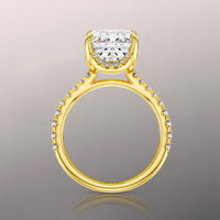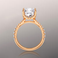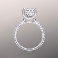 A phenomenal symbol of love. This ring is embraced with an incredibly brilliant round diamond center stone supported by diamond-encrusted u-shaped prongs. The imposing central gem sits high on a polished cathedral band with gracefully arching shoulders pavé-set with round diamonds in tapering sizes. This ring shines no matter which side you look at it, making a powerful statement.