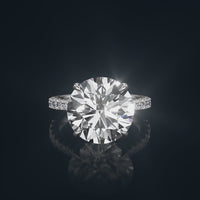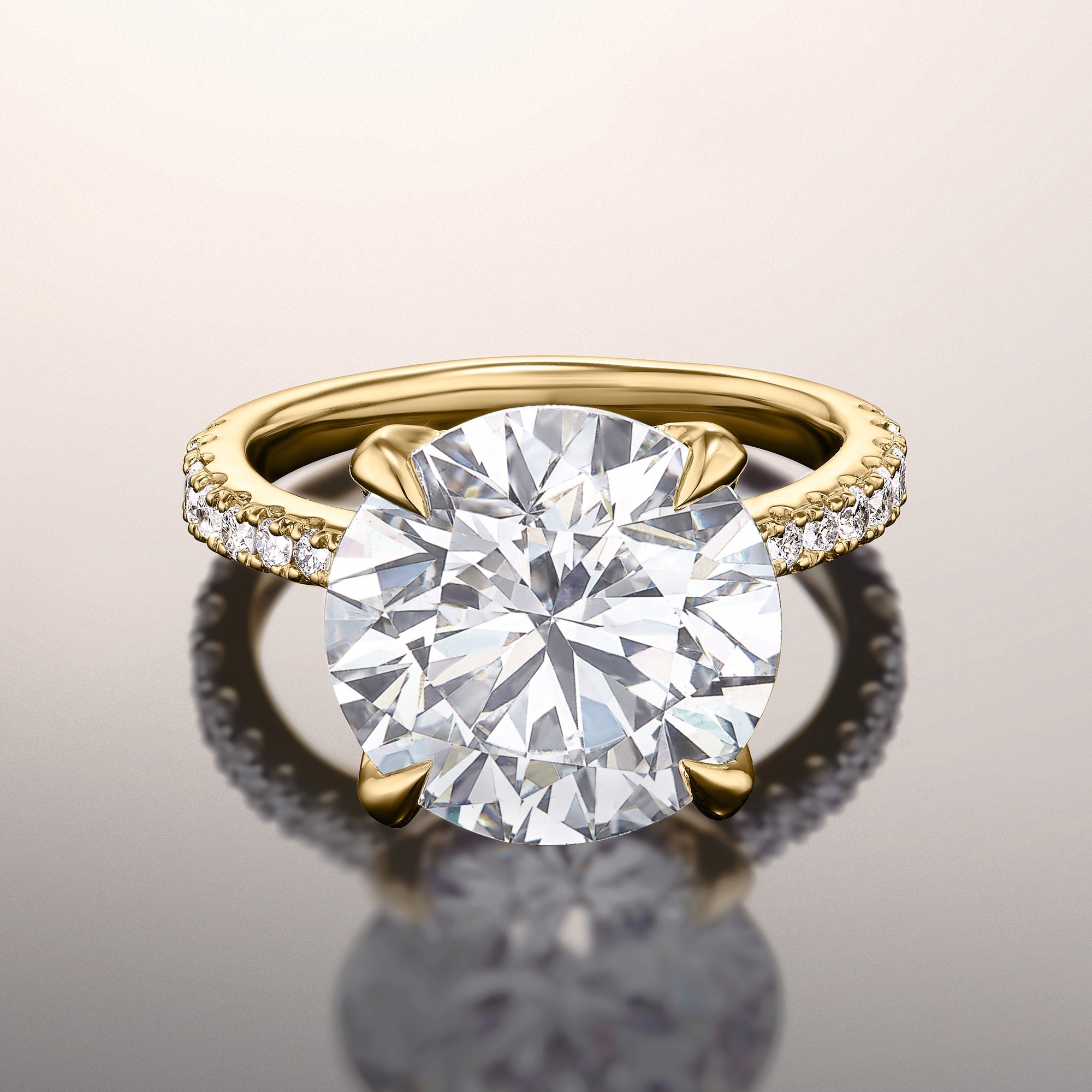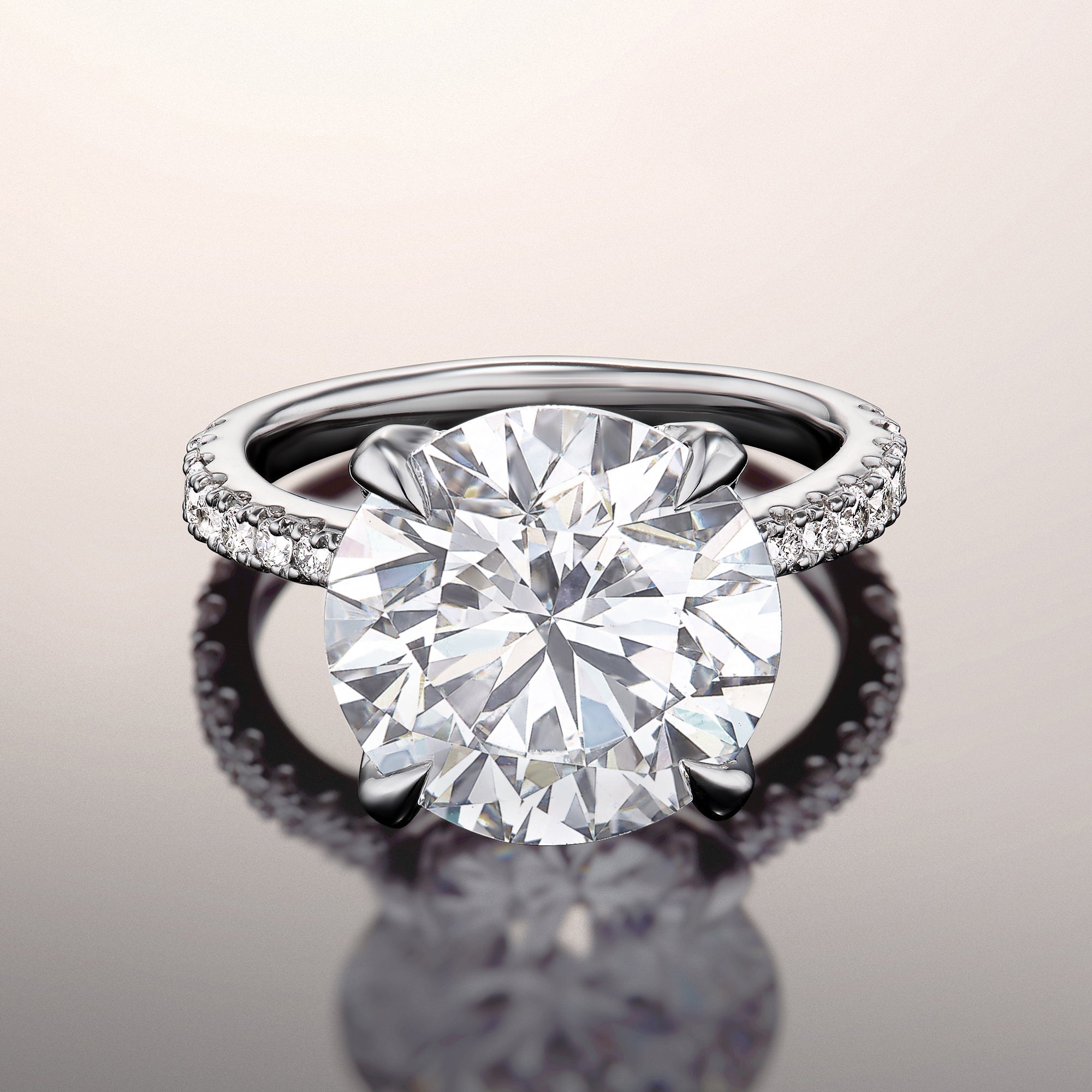 A phenomenal symbol of love. This ring is embraced with an incredibly brilliant round diamond center stone supported by diamond-encrusted u-shaped prongs. The imposing central gem sits high on a polished cathedral band with gracefully arching shoulders pavé-set with round diamonds in tapering sizes. This ring shines no matter which side you look at it, making a powerful statement.